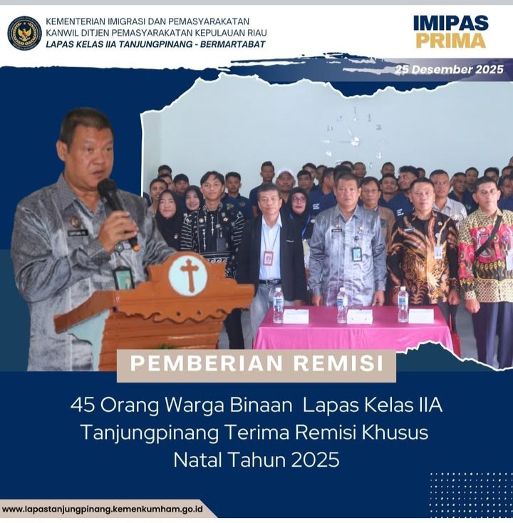 Remisi Khusus Natal 2025 diserahkan langsung oleh Kepala Lapas Kelas IIA Tanjungpinang, Untung Cahyo Sidharto, kepada perwakilan warga binaan dalam kegiatan yang berlangsung di lingkungan Lapas Kelas IIA Tanjungpinang. Dari total 45 warga binaan penerima remisi, rincian besaran remisi yang diberikan yakni 15 hari kepada 1 orang, 1 bulan kepada 35 orang, 1 bulan 15 hari kepada 7 orang, serta 2 bulan kepada 2 orang.