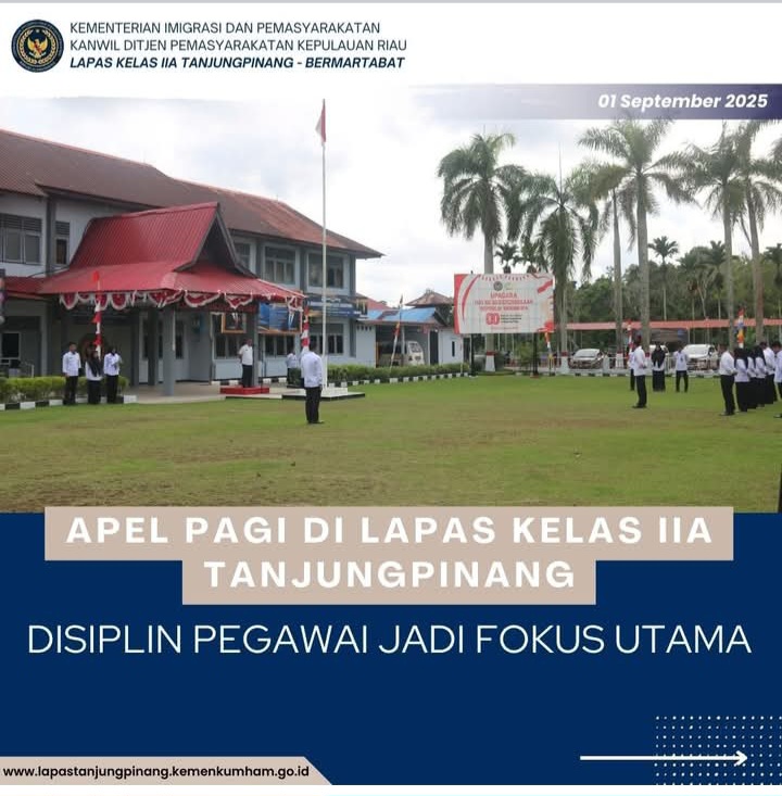 Beritabintan.co.id, Bintan (Kepri)- Lapas Kelas IIA Tanjungpinang melaksanakan apel pagi yang diikuti oleh seluruh jajaran pegawai. Kegiatan rutin ini tidak hanya menjadi wadah penyampaian arahan, tetapi juga sebagai momentum untuk memperkuat kedisiplinan dan komitmen pegawai dalam menjalankan tugas, Senin (01/09/2025).