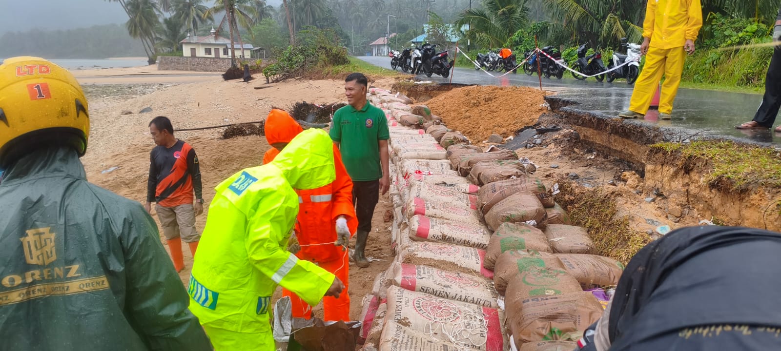 Kegiatan yang dimulai sejak pukul 07.30 WIB tersebut merupakan respons cepat terhadap kerusakan ruas jalan akibat abrasi pantai yang berpotensi mengganggu keselamatan pengguna jalan serta aktivitas sosial dan ekonomi masyarakat.