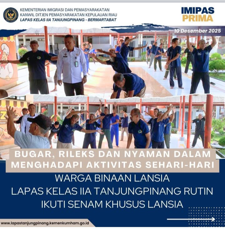 Beritabintan.co.id, Bintan (Kepri)- Lembaga Pemasyarakatan Kelas IIA Tanjungpinang menggelar kegiatan senam bersama bagi para warga binaan lanjut usia (lansia) sebagai bagian dari program kesehatan rutin, Rabu (10/12/2025).
