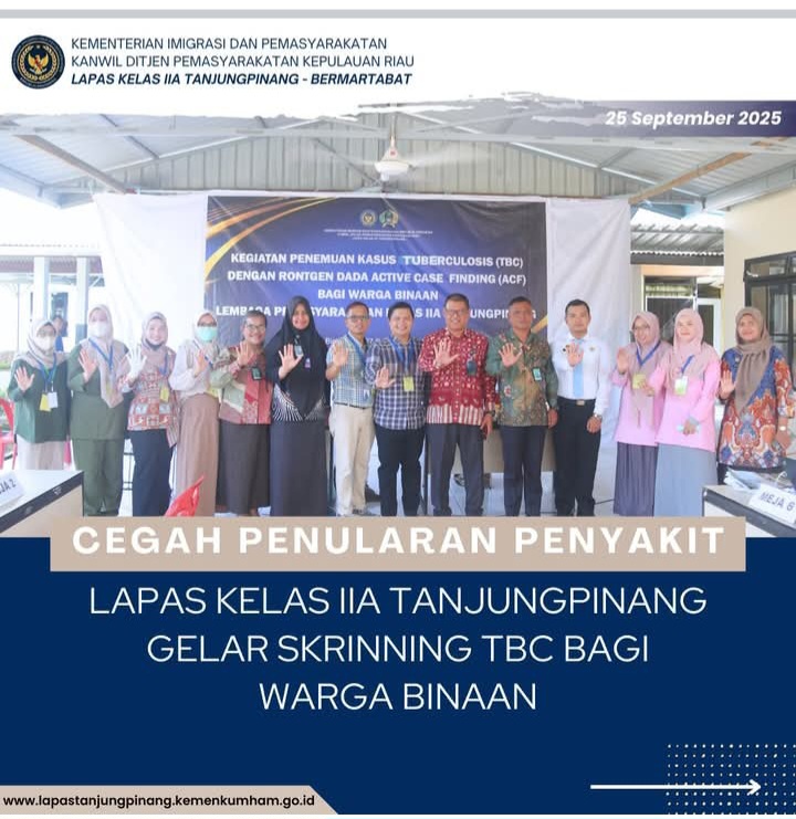 Beritabintan.co.id, Bintan (Kepri)- Sebagai upaya deteksi dini Tuberkolosis (TBC), Lembaga Pemasyarakatan Kelas IIA Tanjungpinang menggelar kegiatan skrining tuberkulosis (TBC) bagi Warga Binaan melalui metode Chest X-Ray di Klinik dan Ruang Besuk Lapas Kelas IIA Tanjungpinang, Kamis (25/09/2025).