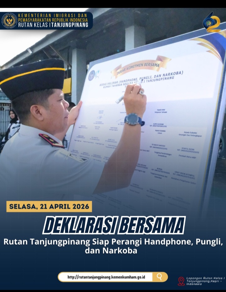Beritabintan.co.id, Tanjungpinang (Kepri)-Seusai pelaksanaan upacara penyematan tanda kenaikan pangkat, Rumah Tahanan Negara Kelas I Tanjungpinang melanjutkan kegiatan dengan pengucapan Ikrar Komitmen Bersama Bebas dari Handphone, Pungli, dan Narkoba (Halinar), yang digelar di lapangan utama rutan, Selasa (21/04)
