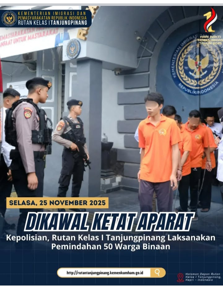 Beritabintan.co.id, Tanjungpinang (Kepri)-Sebanyak 50 Warga Binaan Pemasyarakatan (WBP) Rutan Kelas I Tanjungpinang dipindahkan menuju Lapas Kelas IIA Tanjungpinang dan Lapas Narkotika Tanjungpinang, Selasa (25/11). Proses pemindahan berlangsung aman dan lancar dengan pengawalan ketat aparat kepolisian.