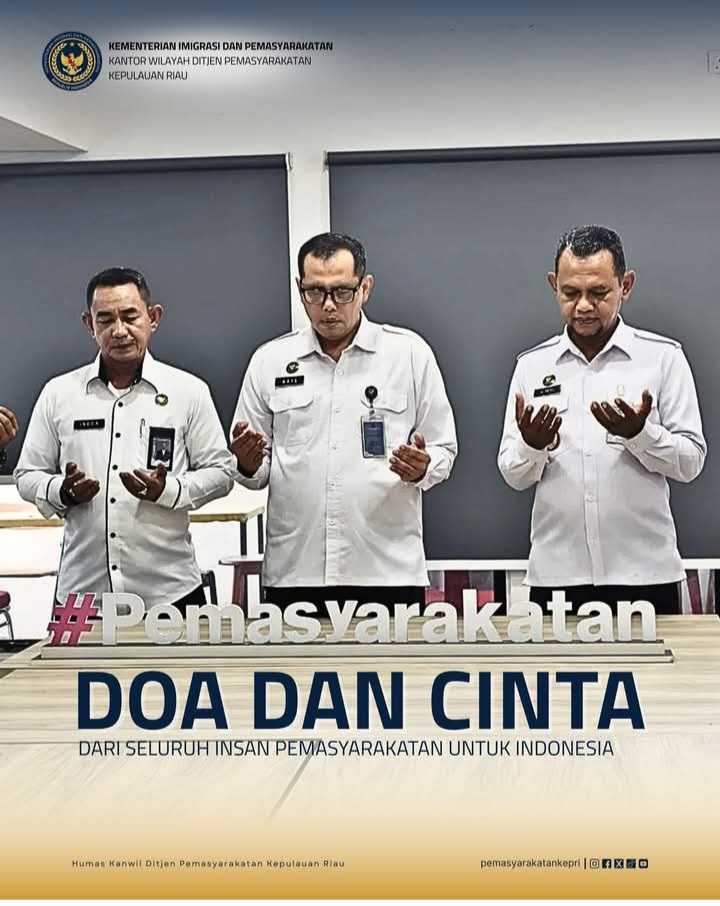 Kegiatan yang berlangsung khidmat ini dipimpin langsung oleh Kepala Kantor Wilayah Direktorat Jenderal Pemasyarakatan Kepulauan Riau, Aris Munandar, didampingi Kepala Bagian Tata Usaha dan Umum, Heru Trisulistiyono, serta Kepala Bidang Pembimbingan Kemasyarakatan, Indra Kesuma. Doa bersama ini diikuti oleh jajaran pegawai Kanwil Ditjenpas Kepri sebagai bentuk rasa cinta tanah air serta kepedulian terhadap situasi kebangsaan yang tengah dihadapi.