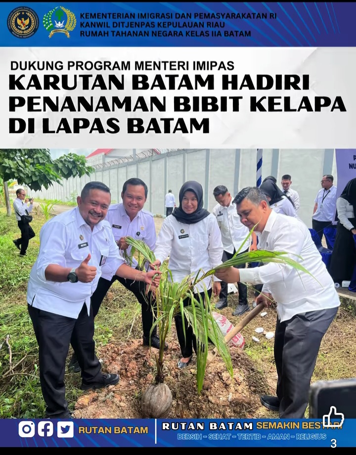 “Penanaman bibit kelapa ini memiliki makna yang lebih luas. Selain sebagai langkah nyata mendukung kelestarian lingkungan, kegiatan ini juga mempererat hubungan baik antara Rutan, Lapas, serta instansi terkait di Kota Batam,” ujarnya.