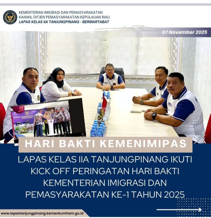 Beritabintan.co.id, Bintan (Kepri)- Lembaga Pemasyarakatan Kelas IIA Tanjungpinang mengikuti kegiatan Kick Off Peringatan Hari Bakti Kementerian Imigrasi dan Pemasyarakatan (Kemenimipas) Ke-1 Tahun 2025 yang dilaksanakan secara virtual. Kegiatan ini merupakan tindak lanjut dari Keputusan Menteri Imigrasi dan Pemasyarakatan Nomor MIP-HK.03.02-78 Tahun 2025 tentang Penetapan Hari Lahir Kemenimipas yang ditetapkan pada 19 November 2025, Jumat (07/11/2025).