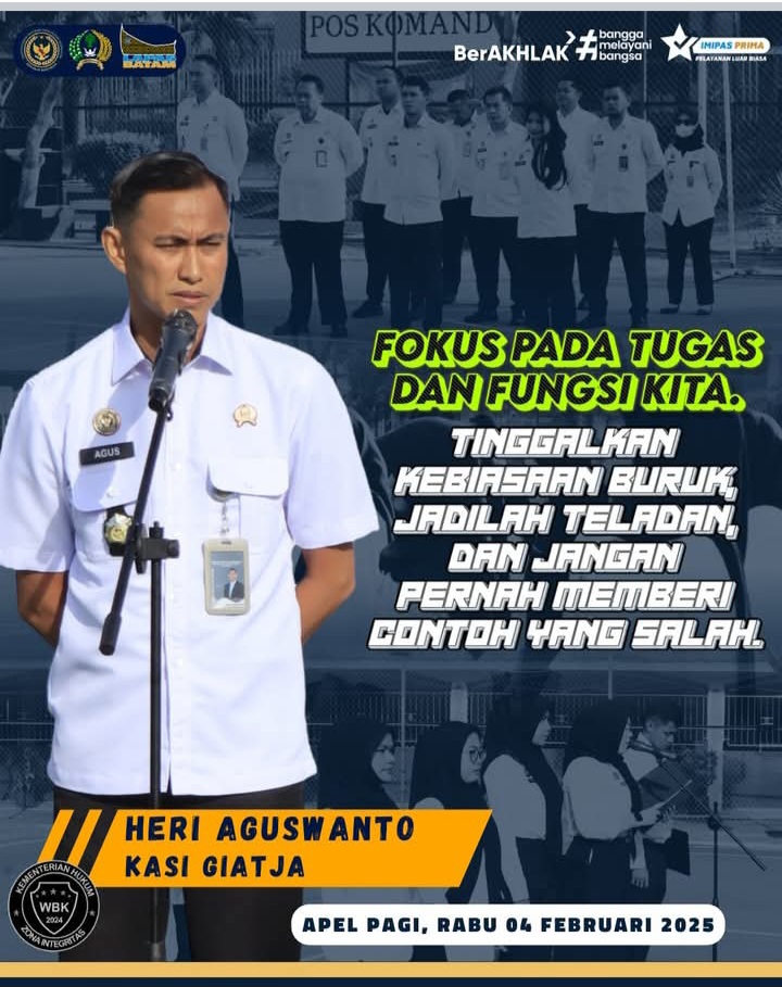Beritabintan.co.id, Batam (Kepri)- Sebuah pesan bermakna dari Bapak Heri Aguswanto dalam kegiatan Apel Pagi di Lapas Batam.