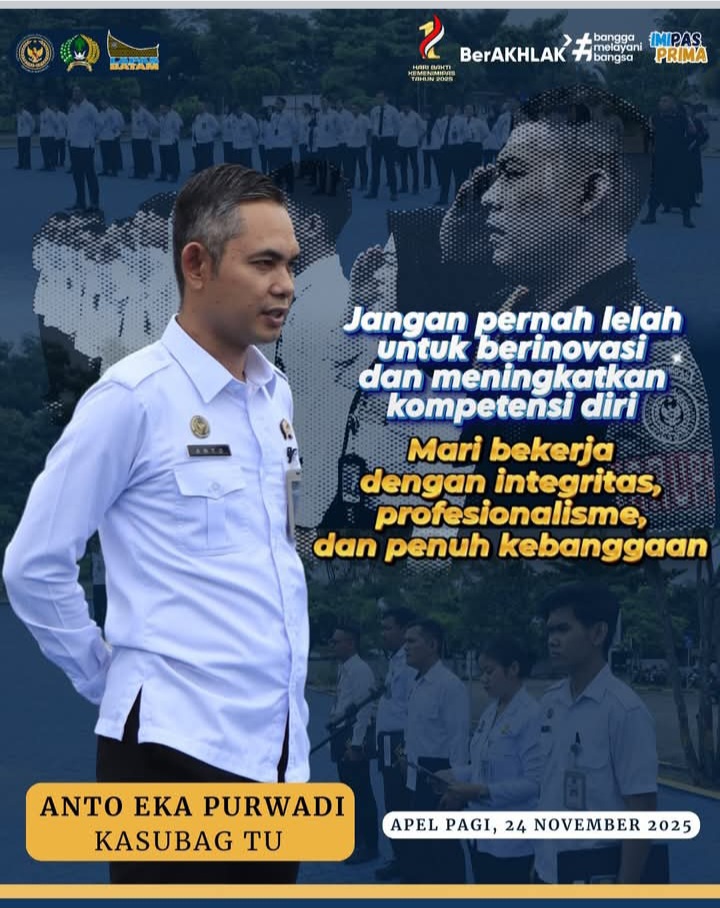 Beritabintan.co.id, Batam (Kepri)- Dalam apel pagi hari ini, Kasubag TU Lapas Batam agar jangan pernah lelah berinovasi dan meningkatkan kompetensi diri. Mari bekerja dengan integritas, profesionalisme, dan penuh kebanggaan. (Maman)