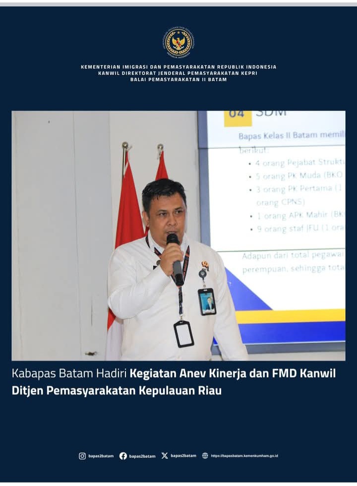 Beritabintan.co.id, Bintan (Kepri)- Kepala Balai Pemasyarakatan (Bapas) Kelas II Batam, Fajar Kusnaldi, mengikuti kegiatan Analisis dan Evaluasi (Anev) Kinerja Pemasyarakatan yang disejalankan dengan Pelatihan Fisik, Mental, dan Disiplin (FMD) bagi jajaran Pemasyarakatan se-Kepulauan Riau. Kegiatan ini berlangsung selama tiga hari, mulai 21 hingga 23 Oktober 2025, bertempat di Bintan Agro Beach Resort.