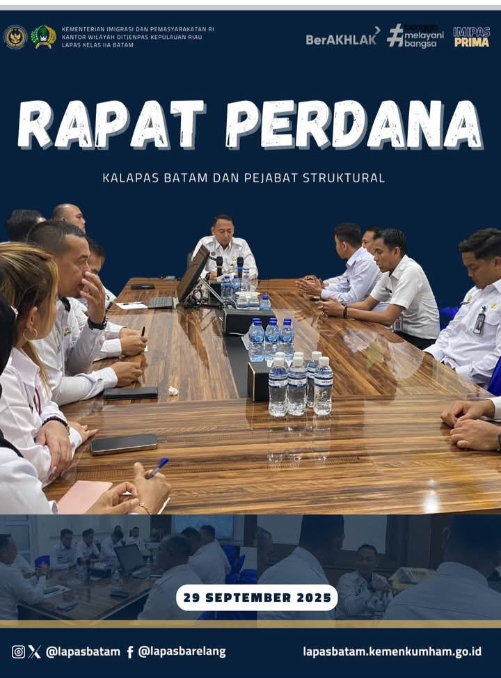Beritabintan.co.id, Batam (Kepri)-  Kepala Lembaga Pemasyarakatan Kelas IIA Batam, Yosafat Rizanto, memimpin rapat perdana bersama seluruh pejabat struktural dan Jabatan Fungsional Tertentu (JFT), Senin(29/9).