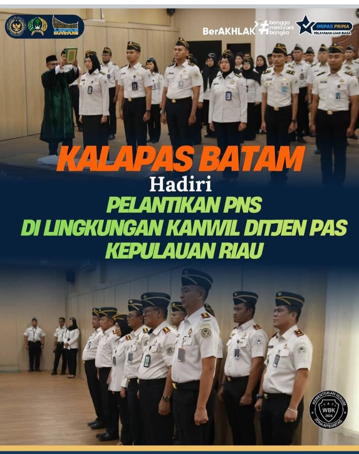 Beritabintan.co.id, Batam (Kepri)- Kalapas Batam beserta Kepala UPT Pemasyarakatan Se-Kepulauan Riau mengikuti Pelantikan Pegawai Negeri Sipil di Lingkungan Ditjen Pemasyarakatan Kepulauan Riau. (Maman)