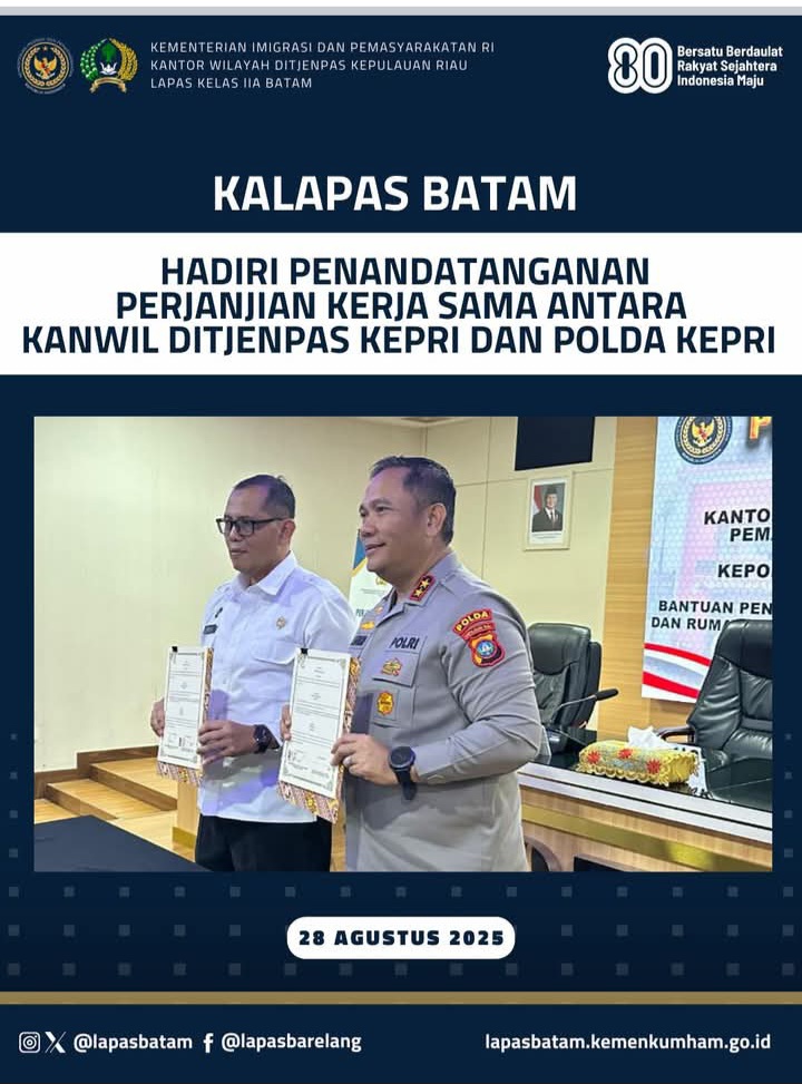 Dengan penandatanganan perjanjian ini, diharapkan terbangun koordinasi yang lebih solid antara Pemasyarakatan dan Kepolisian, demi terwujudnya sistem pemasyarakatan yang aman, tertib, dan profesional di wilayah Kepulauan Riau.  (Maman)