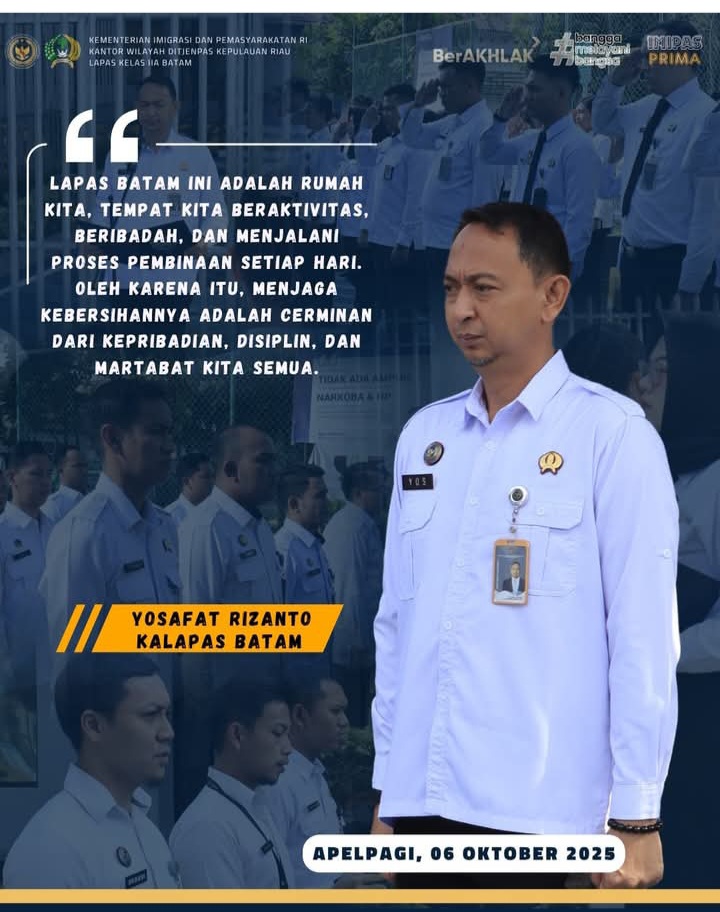 Beritabintan.co.id, Batam (Kepri)- Kalapas Batam Dalam Giat Apel Pagi Senin, 6 Oktober 2025 mengingatkan pada setiap pegawai agar selalu menjaga kebersihan, karena kebersihan adalah cerminan kepribadian, disiplin dan martabat kita semua. (Maman)