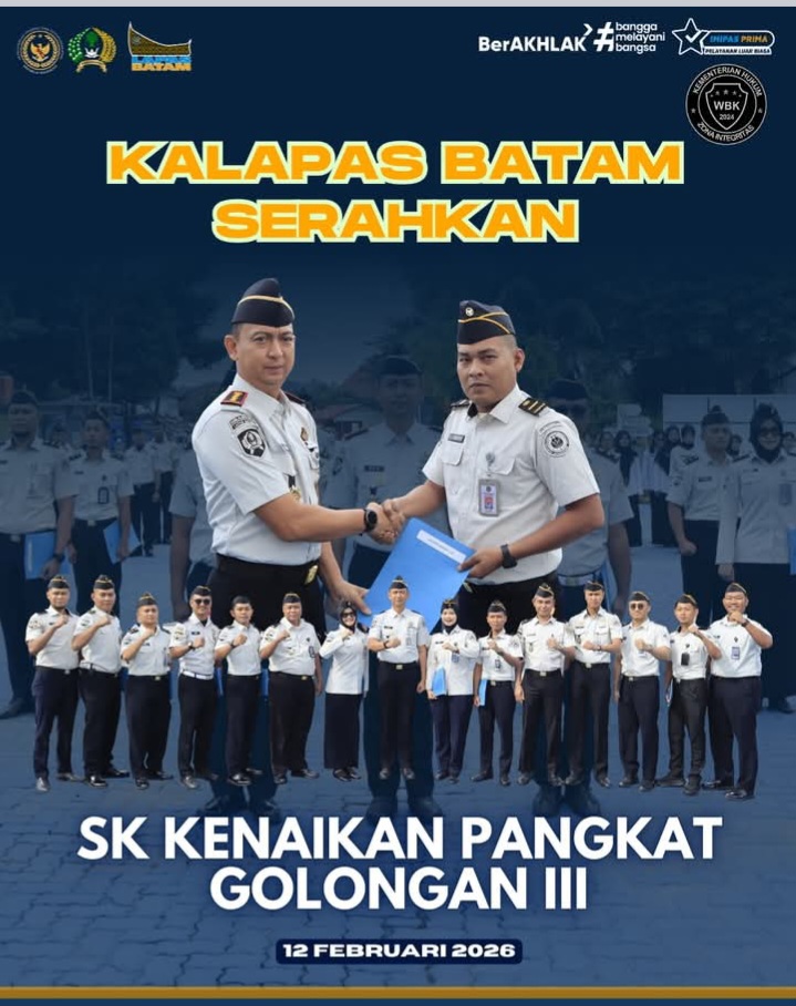 Beritabintan.co.id, Batam (Kepri)- Sebanyak 11 orang petugas Lapas Batam resmi menerima kenaikan pangkat ke Golongan III melalui mekanisme penyesuaian ijazah. Kegiatan pelantikan dan penyematan kenaikan pangkat tersebut berlangsung di Halaman Depan Lapas Batam dan dipimpin langsung oleh Kepala Lapas Batam, Yosafat Rizanto, Kamis (12/2).