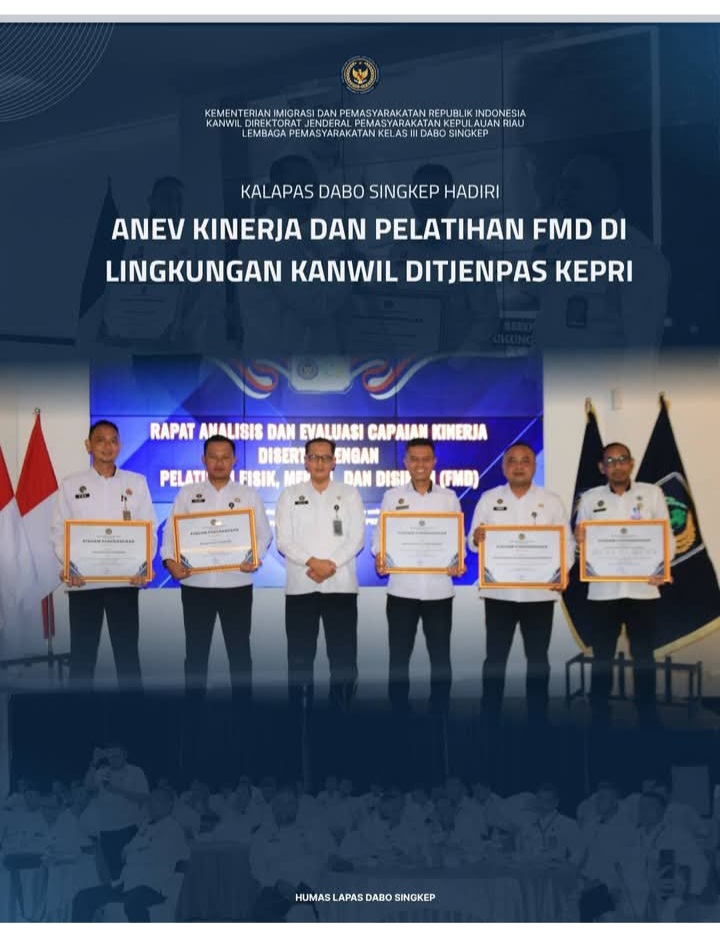 Beritabintan.co.id, Dabo Singkep (Kepri)-Kepala Lembaga Pemasyarakatan Kelas III Dabo Singkep, Yusrifa Arif, menghadiri kegiatan Analisis dan Evaluasi (Anev) Kinerja sekaligus Pelatihan Fisik Mental Disiplin (FMD) yang diselenggarakan oleh Kantor Wilayah Direktorat Jenderal Pemasyarakatan Kepulauan Riau yang mengusung tema “Strategi Peningkatan Kinerja Pemasyarakatan Untuk Mewujudkan Pemasyarakatan Yang Semakin PRIMA”, Selasa-Kamis (21-23/10/2025) bertempat di Bintan Agro Beach Resort, Bintan, Kepulauan Riau.