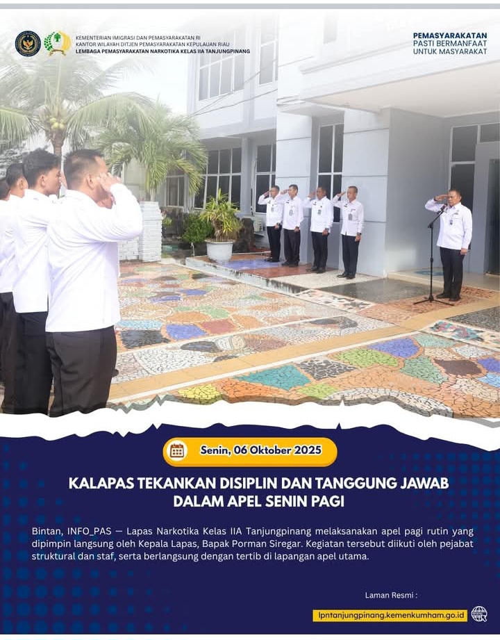 Beritabintan.co.id, Bintan (Kepri)- Lapas Narkotika Kelas IIA Tanjungpinang melaksanakan apel pagi rutin yang dipimpin langsung oleh Kepala Lapas, Bapak Porman Siregar. Kegiatan tersebut diikuti oleh pejabat struktural dan staf, serta berlangsung dengan tertib di lapangan apel.
