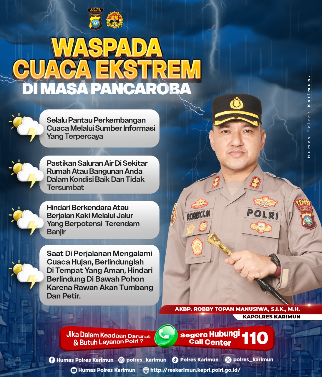 beritabintan.co.id, Karimun (Kepri)- Polres Karimun melalui Kapolres Karimun, AKBP Robby Topan Manusiwa, S.I.K., M.H., mengimbau kepada seluruh masyarakat agar meningkatkan kewaspadaan terhadap potensi cuaca ekstrem di masa pancaroba.
