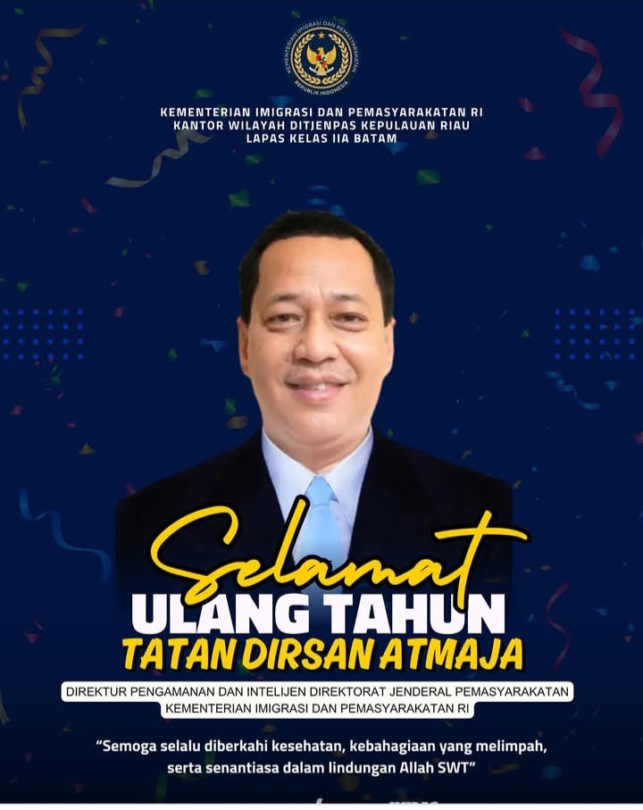 Beritabintan.co.id, Batam (Kepri)- Keluarga Besar Lembaga Pemasyarakatan Kelas IIA Batam mengucapkan Selamat Ulang Tahun kepada Direktur Pengamanan dan Intelijen Direktorat Jenderal Pemasyarakatan Kementerian Imigrasi dan Pemasyarakatan RI, Bapak Tatan Dirsan Atmaja.