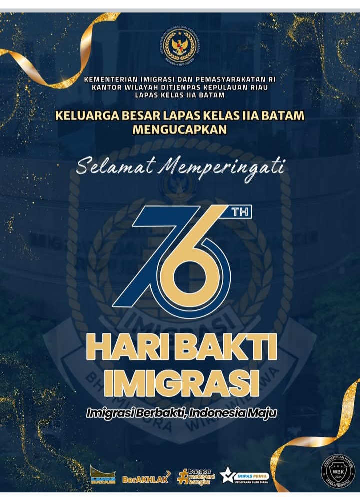 Beritabintan.co.id, Batam (Kepri)- Keluarga Besar Lapas Kelas IIA Batam mengucapkan Selamat Hari Bakti Imigrasi ke-76.