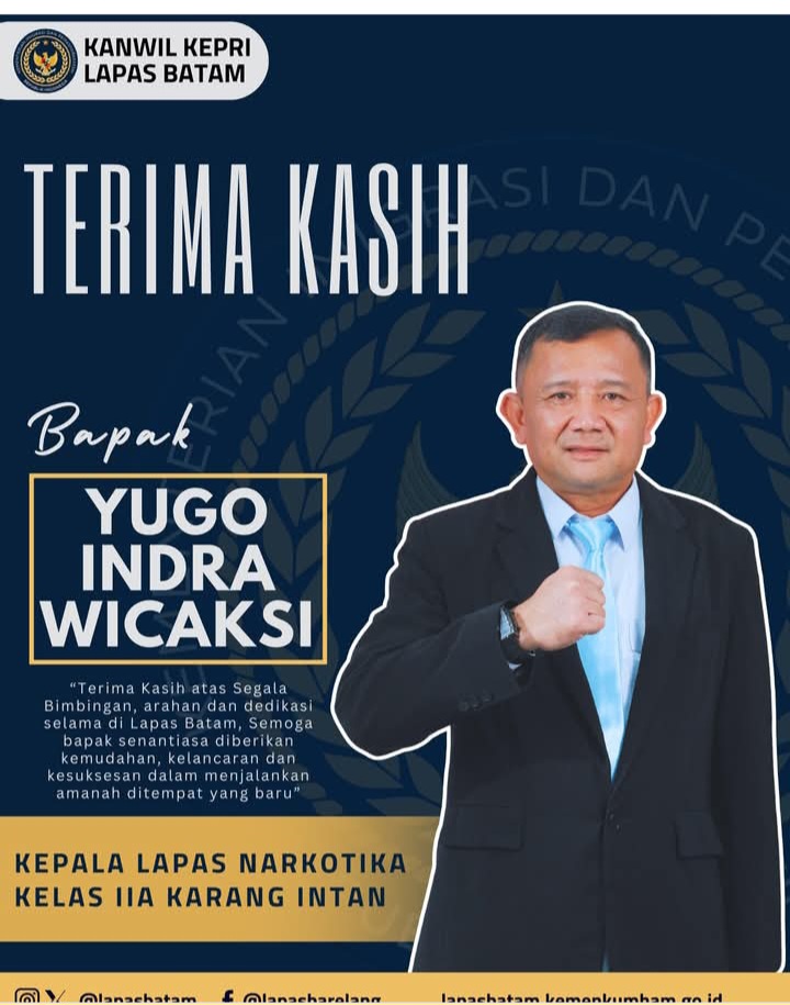Beritabintan.co.id, Batam (Kepri)- Keluarga Besar Lembaga Pemasyarakatan Kelas IIA Batam Mengucapkan Terima Kasih kepada Bapak Yugo Indra Wicaksi atas Segala Bimbingan, arahan dan dedikasi selama di Lapas Batam, Semoga bapak senantiasa diberikan kemudahan, kelancaran dan kesuksesan dalam menjalankan amanah ditempat yang baru.  (Maman)