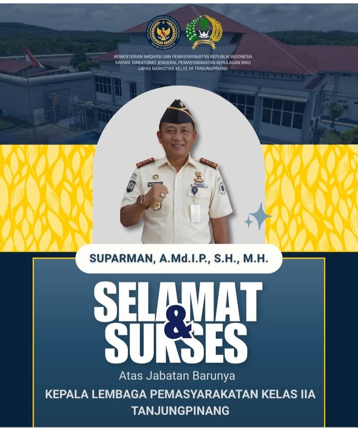 Keluarga Besar Lapas Narkotika Kelas IIA Tanjungpinang mengucapkan Selamat dan Sukses atas Pelantikan & Serah Terima Jabatan Bapak Suparman, A.Md.I.P., S.H., M.H. Sebagai Kepala Lembaga Pemasyarakatan Kelas IIA Tanjungpinang