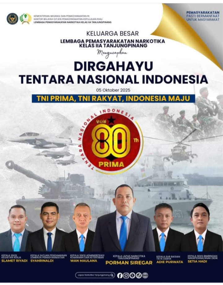 Beritabintan.co.id, Bintan (Kepri)- Keluarga Besar Lapas Narkotika Kelas IIA Tanjungpinang mengucapkan Dirgahayu Tentara Nasional Indonesia.