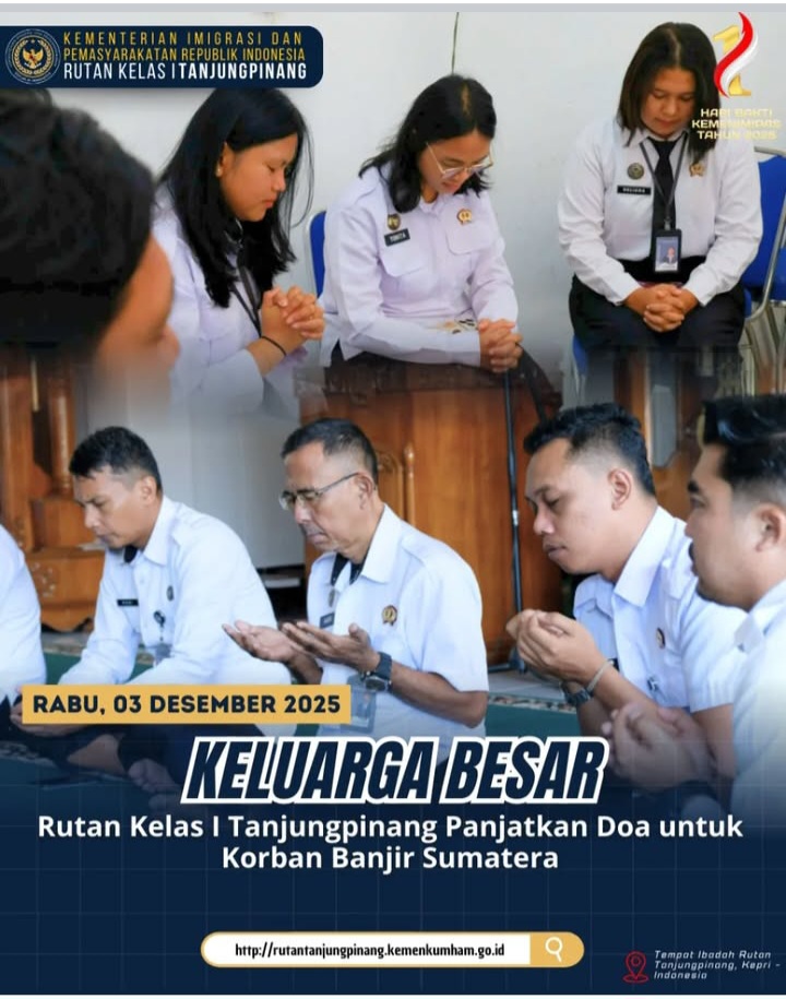 Beritabintan.co.id, Tanjungpinang (Kepri)-Rumah Tahanan Negara (Rutan) Kelas I Tanjungpinang melaksanakan kegiatan doa bersama sebagai bentuk solidaritas terhadap masyarakat di beberapa wilayah Pulau Sumatera yang terdampak banjir bandang. Kegiatan ini merupakan tindak lanjut atas instruksi Kantor Wilayah Direktorat Jenderal Pemasyarakatan Kepulauan Riau.