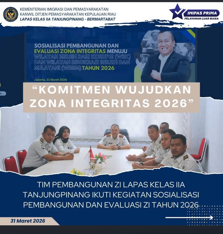 Beritabintan.co.id, Bintan (Kepri)- Lembaga Pemasyarakatan (Lapas) Kelas IIA Tanjungpinang mengikuti kegiatan Sosialisasi Pembangunan dan Evaluasi Zona Integritas menuju Wilayah Bebas dari Korupsi (WBK) dan Wilayah Birokrasi Bersih dan Melayani (WBBM) di lingkungan Kementerian Imigrasi dan Pemasyarakatan Tahun 2026 yang dilaksanakan oleh Inspektorat Jenderal secara daring melalui Zoom Meeting, Selasa (31/03/2026).