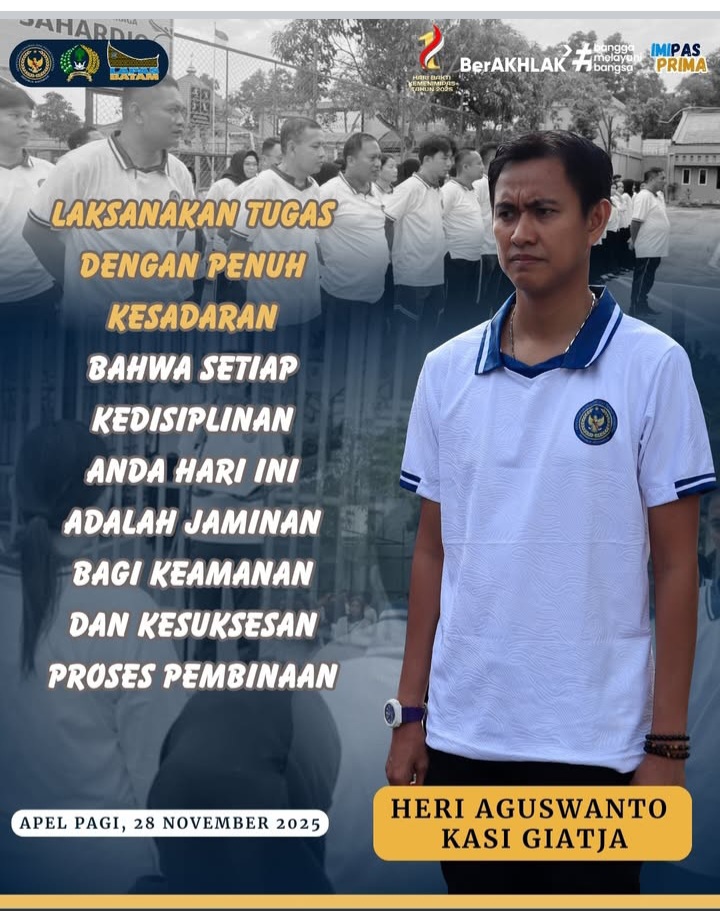 Beritabintan.co.id, Batam (Kepri)- Kasi Kegiatan Kerja mengajak seluruh petugas dan peserta pemagangan yang hadir untuk dengan kesadaran penuh melaksanakan tugas dengan disiplin sebagai bagian dari proses pembinaan. (Maman)