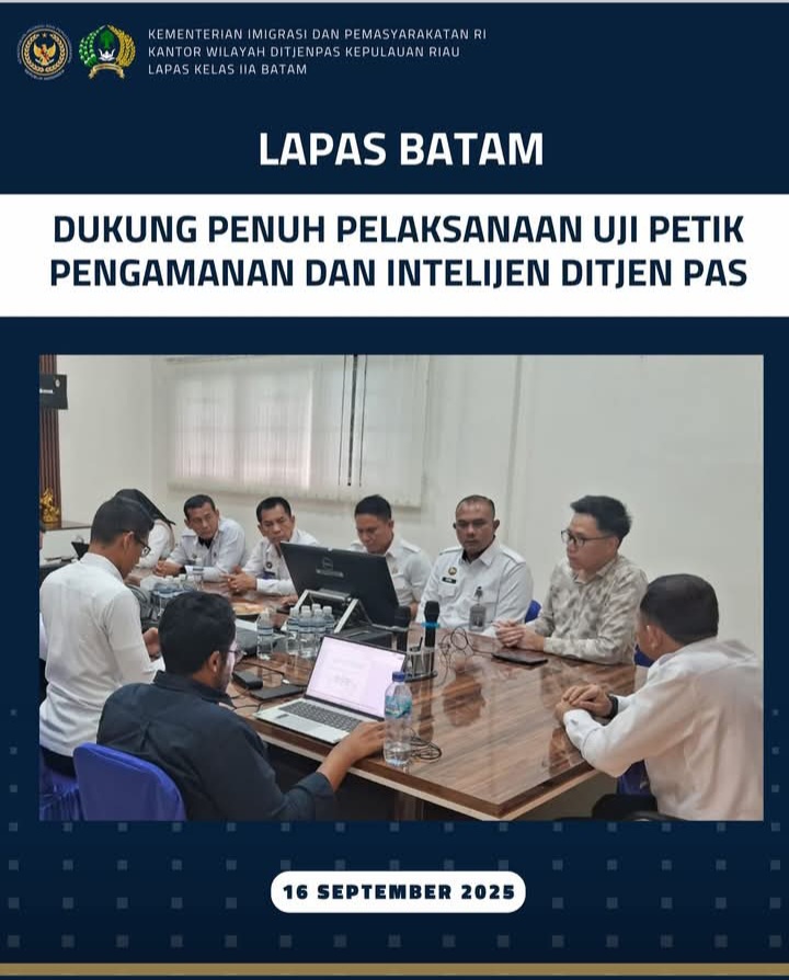 Beritabintan.co.id, Batam (Kepri)- Lembaga Pemasyarakatan (Lapas) Kelas IIA Batam menyatakan dukungan penuh terhadap pelaksanaan Uji Petik Bidang Pengamanan dan Intelijen Tahun 2025 yang diselenggarakan oleh Direktorat Jenderal Pemasyarakatan (Ditjen PAS) Kementerian Hukum dan HAM RI.