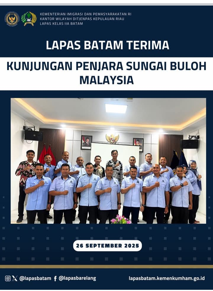 Beritabintan.co.id, Batam (Kepri)- Lembaga Pemasyarakatan (Lapas) Kelas IIA Batam menerima kunjungan dari delegasi Penjara Sungai Buloh, Malaysia. Kunjungan ini bertujuan untuk melihat secara langsung program pembinaan serta lingkungan pemasyarakatan yang dijalankan di Lapas Batam.