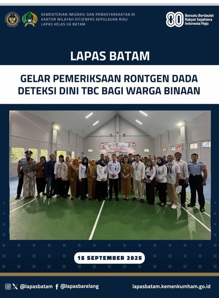 Beritabintan.co.id, Batam (Kepri)-  Lembaga Pemasyarakatan (Lapas) Kelas IIA Batam melaksanakan kegiatan Penemuan Kasus Tuberkulosis (TBC) melalui pemeriksaan rontgen dada atau Active Case Finding (ACF) TBC kepada Warga Binaan Pemasyarakatan (WBP).