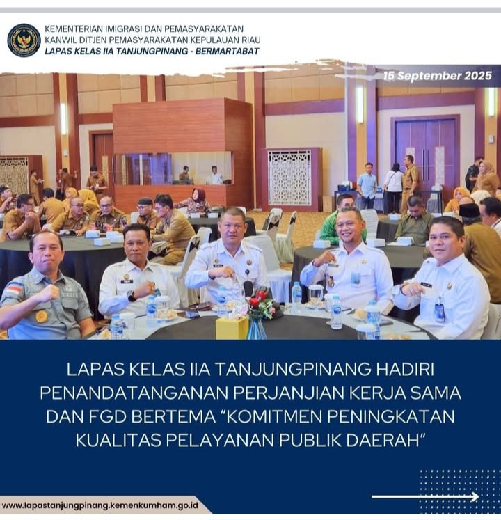 Beritabintan.co.id, Bintan (Kepri)- Lapas Kelas IIA Tanjungpinang turut menghadiri kegiatan Penandatanganan Perjanjian Kerja Sama (PKS) dan Focus Group Discussion (FGD) dengan tema “Komitmen Peningkatan Kualitas Pelayanan Publik Daerah”. Acara penting ini digelar sebagai langkah strategis memperkuat koordinasi dan kolaborasi lintas instansi dalam meningkatkan mutu layanan publik di Kepulauan Riau, Senin (15/09/2025).