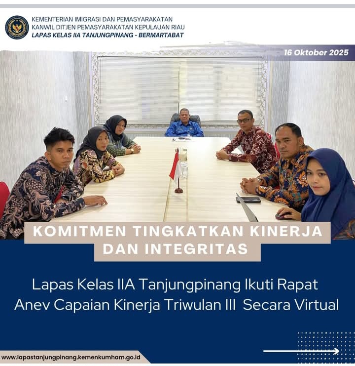 Beritabintan.co.id, Bintan (Kepri)- Kepala Lembaga Pemasyarakatan (Lapas) Kelas IIA Tanjungpinang, Untung Cahyo Sidharto, bersama jajaran Kepegawaian dan Umum mengikuti Rapat Analisis dan Evaluasi (Anev) Capaian Kinerja Triwulan III Tahun 2025 yang digelar oleh Kementerian Imigrasi dan Pemasyarakatan (Kemenimipas) secara virtual melalui Zoom Meeting. Kegiatan ini berlangsung di Ruang Rapat Lapas Kelas IIA Tanjungpinang dengan penuh antusiasme dan semangat evaluasi, Kamis (16/10/2025).