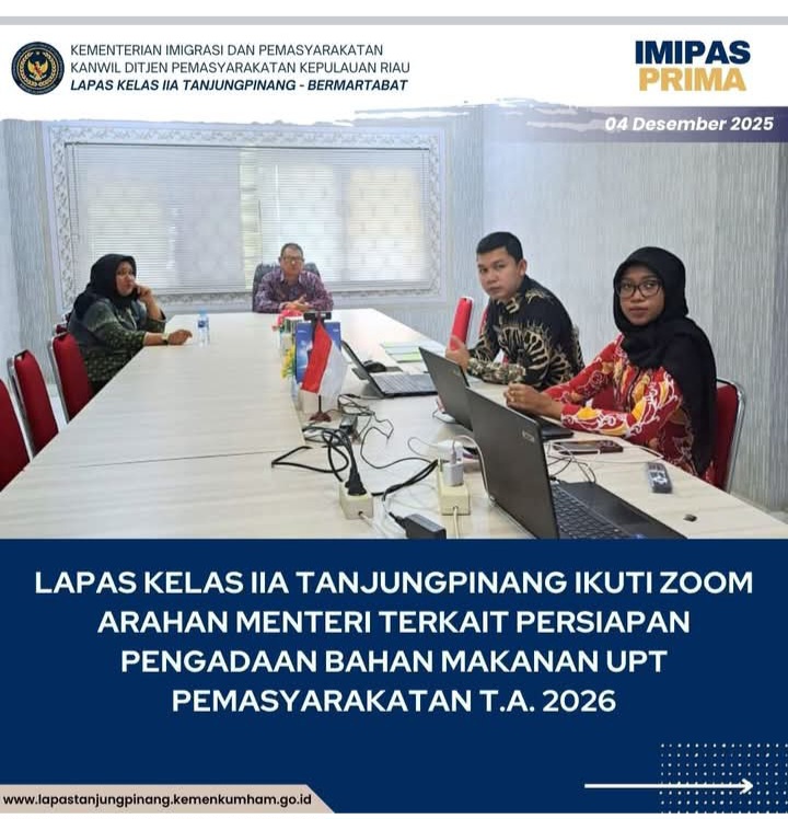Beritabintan.co.id, Bintan (Kepri)- Lapas Kelas IIA Tanjungpinang mengikuti Zoom Meeting Arahan Menteri Imigrasi dan Pemasyarakatan terkait persiapan pengadaan bahan makanan untuk Unit Pelaksana Teknis (UPT) Pemasyarakatan Tahun Anggaran 2026. Kegiatan tersebut dihadiri langsung oleh Kepala Lapas Kelas IIA Tanjungpinang, Untung Cahyo Sidharto, bersama Pejabat Pembuat Komitmen (PPK) dan Staf PPK, Kamis (04 Desember 2025).