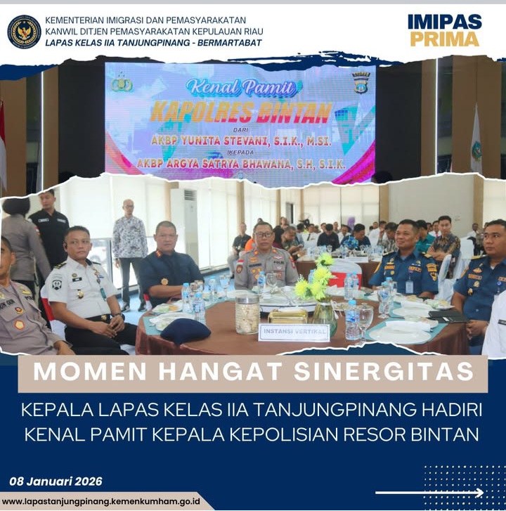 Beritabintan.co.id, Bintan (Kepri)- Kepala Lembaga Pemasyarakatan (Lapas) Kelas IIA Tanjungpinang, Untung Cahyo Sidharto, menghadiri acara Kenal Pamit Kepala Kepolisian Resor (Kapolres) Bintan dari Ibu AKBP Yunita Stevani S.I.K., M.Si. kepada Bapak AKBP Argya Satrya Bhawana, S.H., S.I.K., yang berlangsung di di Aula Kantor Bupati Bintan, Desa Bintan Buyu, Kamis (08/01/2026).