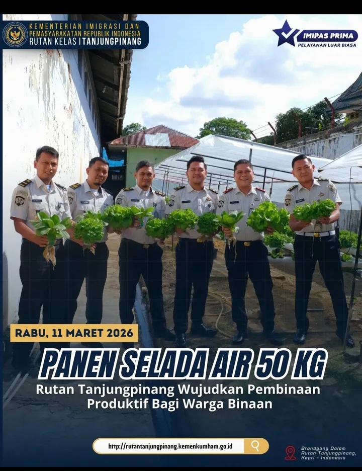 Beritabintan.co.id, Tanjungpinang (Kepri)-Rumah Tahanan Negara (Rutan) Kelas I Tanjungpinang melaksanakan kegiatan panen sayuran selada air sebanyak 50 kilogram yang ditanam secara hidroponik di area brandgang dalam Rutan, Rabu (11/03/2026). Kegiatan ini merupakan bagian dari upaya mendukung program ketahanan pangan nasional sekaligus sebagai bentuk pembinaan kemandirian bagi warga binaan.