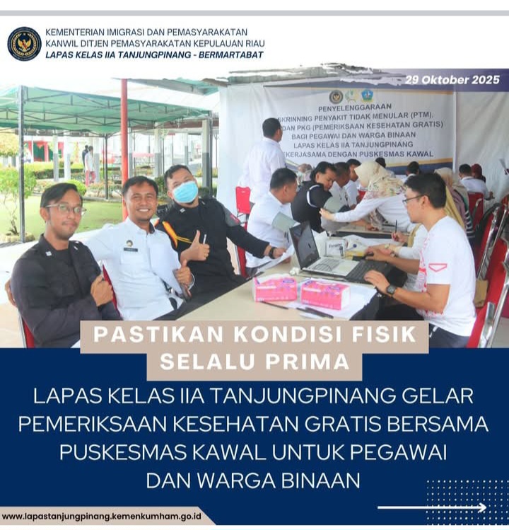 Beritabintan.co.id, Bintan (Kepri)- Lembaga Pemasyarakatan Kelas IIA Tanjungpinang menunjukkan komitmen nyata dalam menjaga kesehatan pegawai dan warga binaan dengan menggelar Pemeriksaan Kesehatan Gratis yang bekerja sama dengan Puskesmas Kawal, Rabu (29/10/2025).