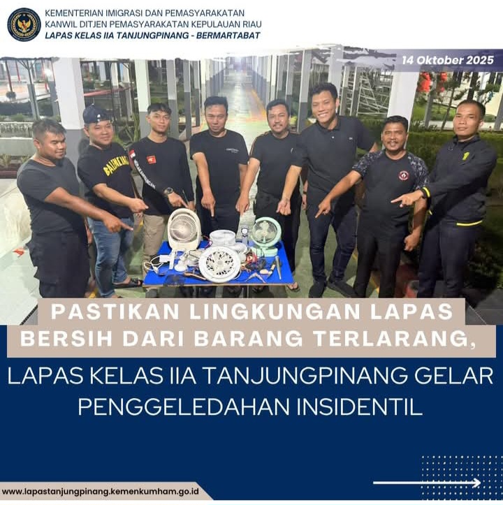 Beritabintan.co.id, Bintan (Kepri)- Dalam rangka menjaga keamanan dan ketertiban (kamtib) serta bersih dari Handphone, Pungli, dan Narkoba (Halinar) di dalam lingkungan lapas, Lembaga Pemasyarakatan Kelas IIA Tanjungpinang melaksanakan kegiatan peggeledahan insidentil terhadap kamar hunian Warga Binaan, Selasa dini hari (14/10/2025).