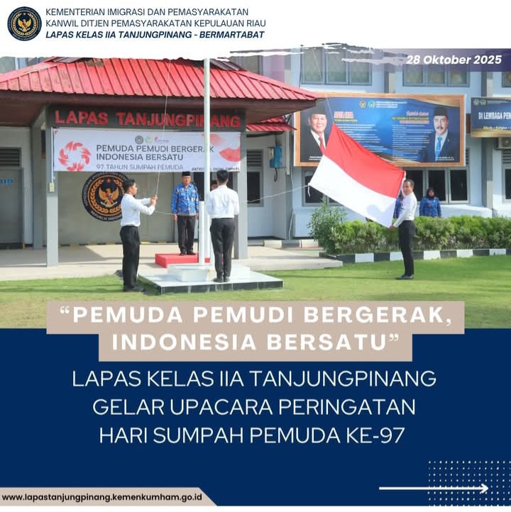 Peringatan Hari Sumpah Pemuda tahun ini menjadi momentum penting bagi seluruh jajaran Lapas Kelas IIA Tanjungpinang untuk meneguhkan kembali semangat persatuan, kerja keras, dan pengabdian, terutama dalam menjalankan tugas pemasyarakatan dengan integritas dan semangat kebangsaan. (Maman)