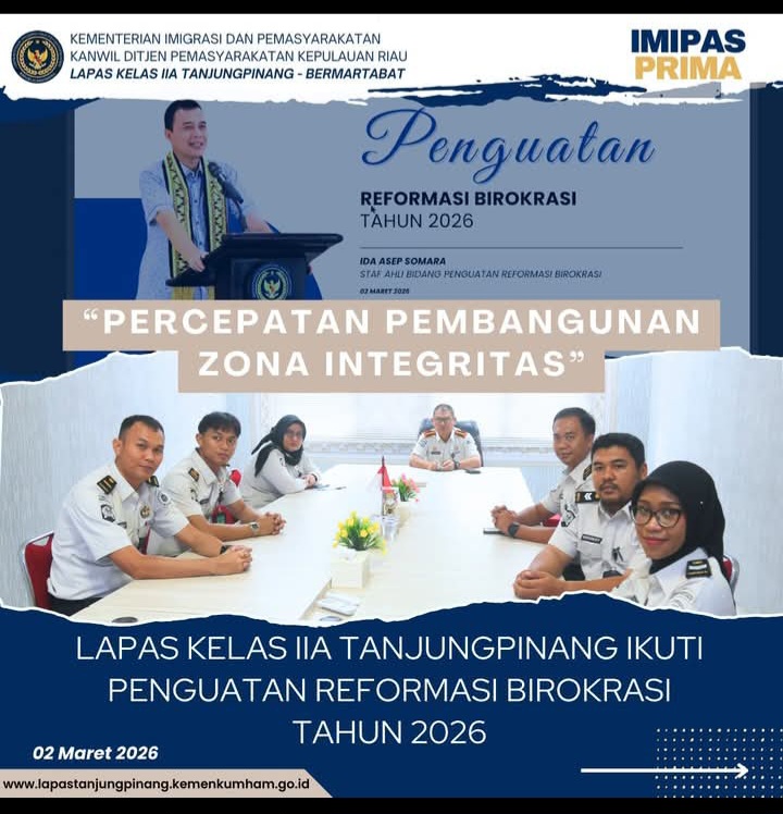 Beritabintan.co.id, Bintan (Kepri)- Kepala Lembaga Pemasyarakatan Kelas IIA Tanjungpinang, Untung Cahyo Sidharto, bersama Pejabat Struktural dan Tim Perencanaan dan Reformasi Birokrasi Lapas Kelas IIA Tanjungpinang mengikuti kegiatan Penguatan Reformasi Birokrasi Tahun 2026 di Lingkungan Kementerian Imigrasi dan Pemasyarakatan yang diselenggarakan secara virtual di Ruang Rapat, Senin (02/03/2026).