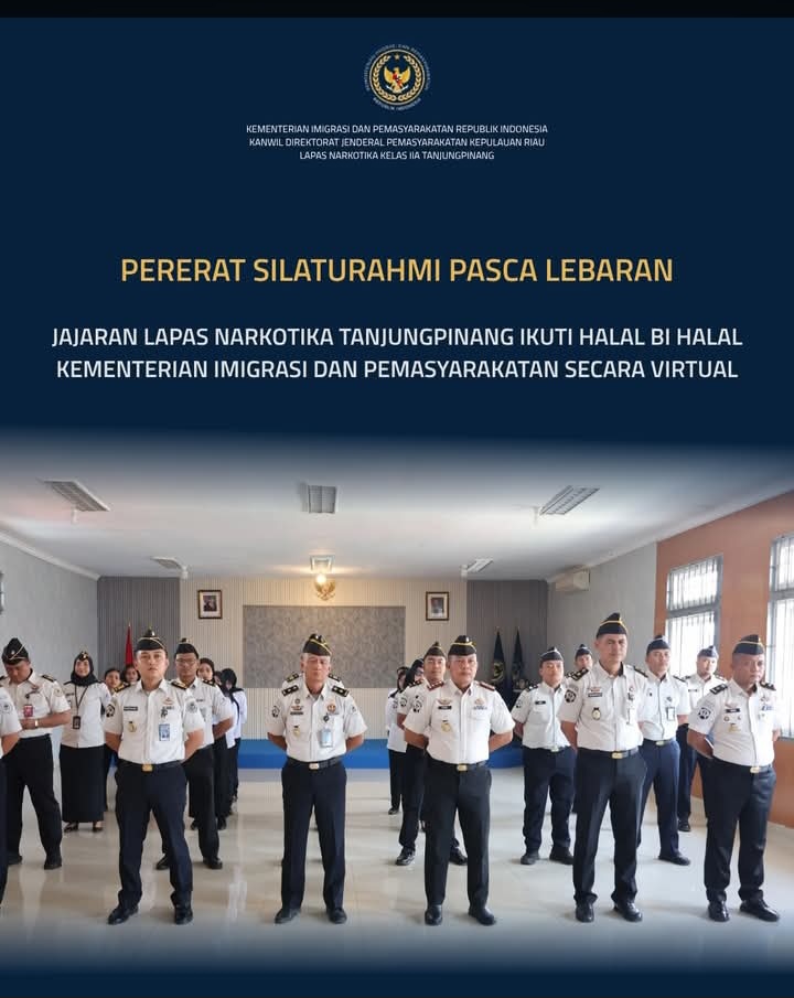 Beritabintan.co.id, Bintan (Kepri)- Seluruh jajaran Lapas Narkotika Kelas IIA Tanjungpinang mengikuti kegiatan Silaturahmi Hari Raya Idul Fitri 1447 H yang diselenggarakan oleh Kementerian Imigrasi dan Pemasyarakatan Republik Indonesia secara virtual melalui aplikasi Zoom, Senin (30/03).