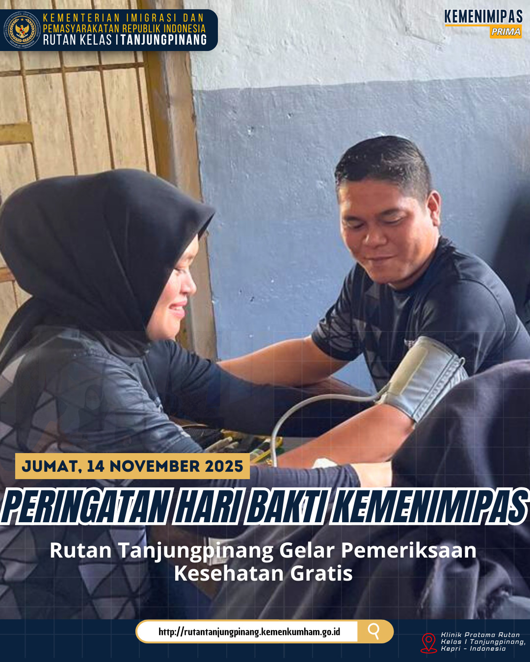Beritabintan.co.id, Tanjungpinang (Kepri)- Dalam rangka memperingati Hari Bakti Kementerian Imigrasi dan Pemasyarakatan (Kemenimipas) ke-1 dengan tema “Satu Langkah, Satu Semangat, Satu Pengabdian untuk Bangsa”, Rumah Tahanan Negara (Rutan) Kelas I Tanjungpinang menyelenggarakan kegiatan pemeriksaan kesehatan gratis bagi pegawai yang diselenggarakan di Klinik Pratama Rutan, Jumat (14/11).