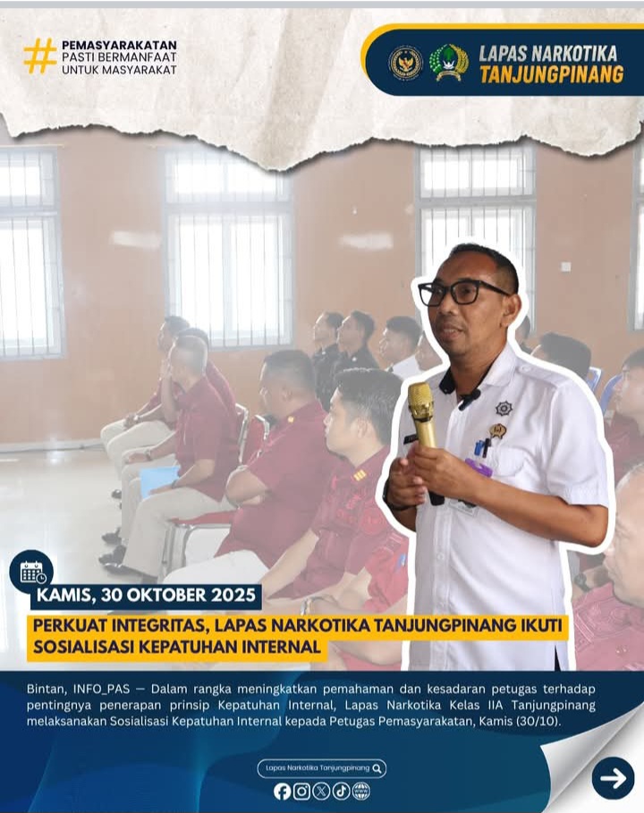 Beritabintan.co.id, Bintan (Kepri)- Dalam rangka meningkatkan pemahaman dan kesadaran petugas terhadap pentingnya penerapan prinsip Kepatuhan Internal, Lapas Narkotika Kelas IIA Tanjungpinang melaksanakan Sosialisasi Kepatuhan Internal kepada Petugas Pemasyarakatan, Kamis (30/10).