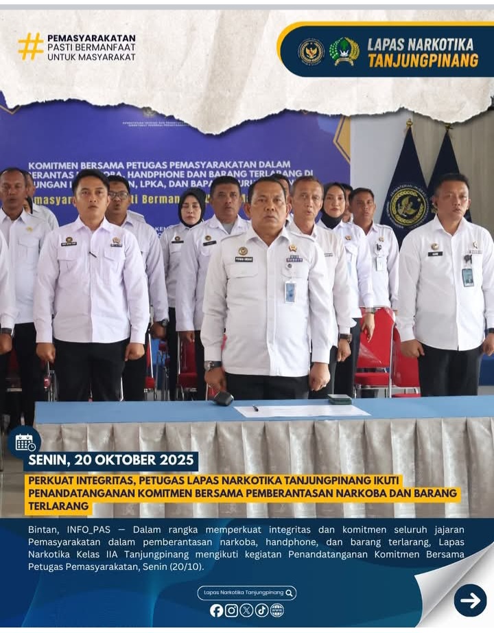 Beritabintan.co.id, Bintan (Kepri)- Dalam rangka memperkuat integritas dan komitmen seluruh jajaran Pemasyarakatan dalam pemberantasan narkoba, handphone, dan barang terlarang, Lapas Narkotika Kelas IIA Tanjungpinang mengikuti kegiatan Penandatanganan Komitmen Bersama Petugas Pemasyarakatan, Senin (20/10).