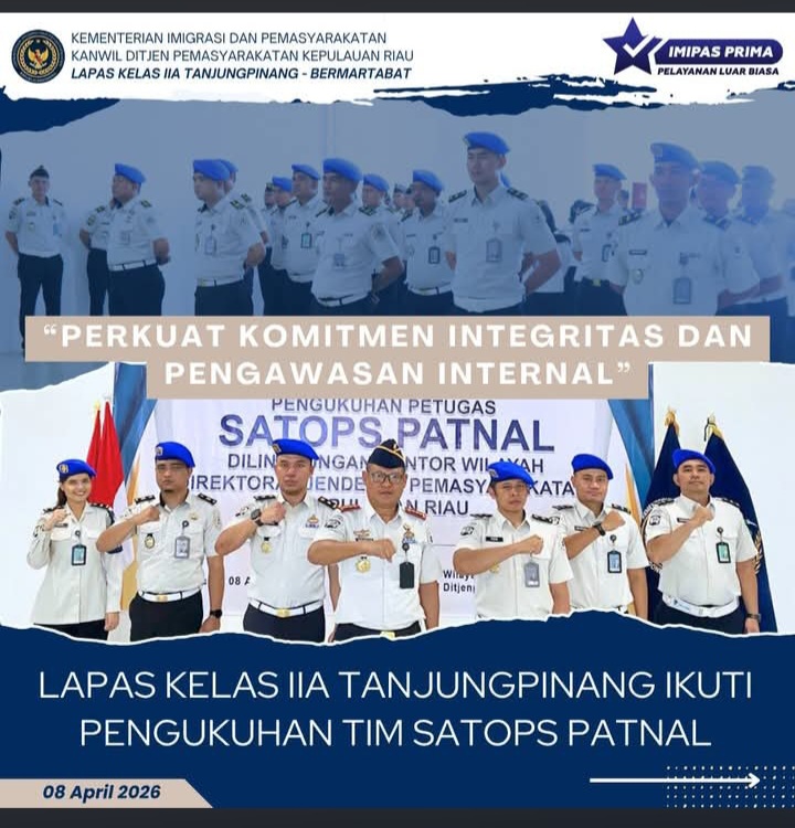 Beritabintan.co.id, Bintan (Kepri)- Dalam rangka memperkuat pengawasan serta meningkatkan kepatuhan internal, Lembaga Pemasyarakatan (Lapas) Kelas IIA Tanjungpinang mengikuti Upacara Pengukuhan Petugas Satuan Operasi Kepatuhan Internal (Satops Patnal) di lingkungan Kantor Wilayah Direktorat Jenderal Pemasyarakatan Kepulauan Riau di Aula Kanwil Ditjenpas Kepri, Rabu (08/04/2026).