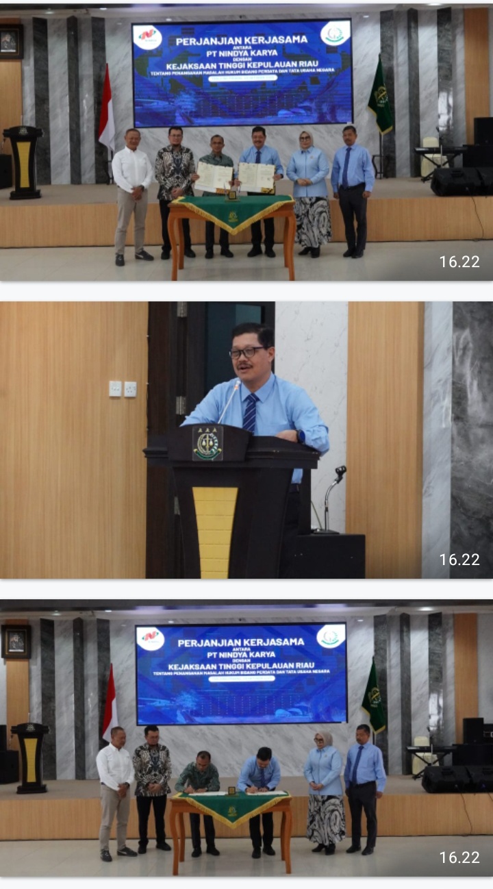 Beritabintan.co.id, Tanjungpinang (Kepri)-Kejaksaan Tinggi Kepulauan Riau dan PT. Nindya Karya (Persero) resmi menandatangani Perjanjian Kerja Sama tentang Penanganan Masalah Hukum di Bidang Perdata dan Tata Usaha Negara.