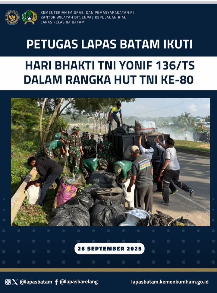 Beritabintan.co.id, Batam (Kepri)- Dalam rangka memperingati Hari Ulang Tahun (HUT) ke-80 Tentara Nasional Indonesia (TNI), petugas Lembaga Pemasyarakatan (Lapas) Kelas IIA Batam turut serta dalam kegiatan Hari Bhakti TNI Yonif 136/TS yang dilaksanakan melalui aksi gotong royong di area Tembesi, Kota Batam.