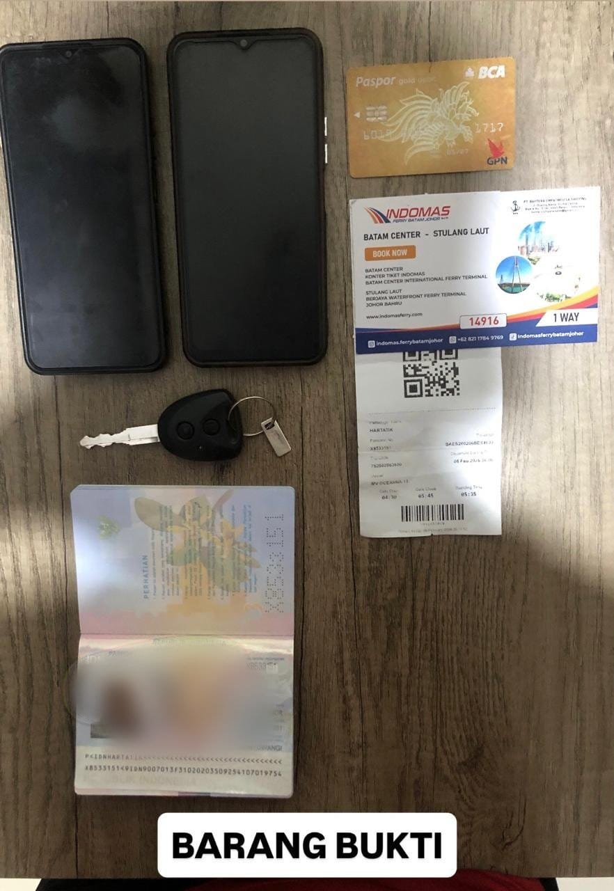 Adapun, Polda Kepri berhasil mengamankan sejumlah barang bukti berupa *1 (satu) buah paspor*, *1 (satu) lembar tiket kapal tujuan Stulang Laut Malaysia*, serta *1 (satu) lembar boarding pass milik korban*, termasuk *1 (satu) unit mobil yang digunakan sebagai sarana transportasi*.