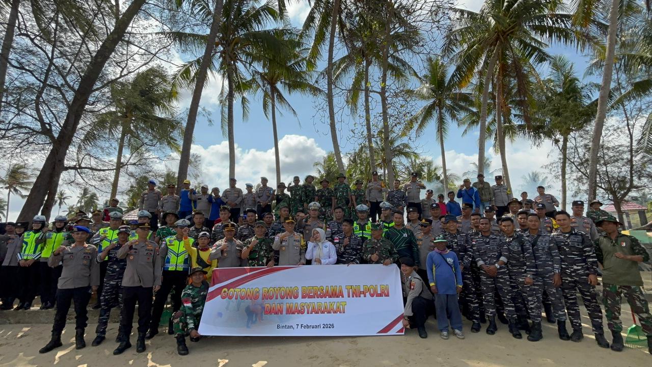 Beritabintan.co.id, Bintan (Kepri)- Dalam rangka mendukung program nasional Gerakan Indonesia Asri 2026 yang dicanangkan Presiden Republik Indonesia, Polres Bintan menggelar kegiatan gotong royong bersama TNI dan masyarakat dengan sasaran pembersihan pesisir Pantai Cabana Desa Malang Rapat Kecamatan Gunung Kijang dan pantai Taman kota kp. Bugis Kec. Bintan Utara, Sabtu (07/02/2026).